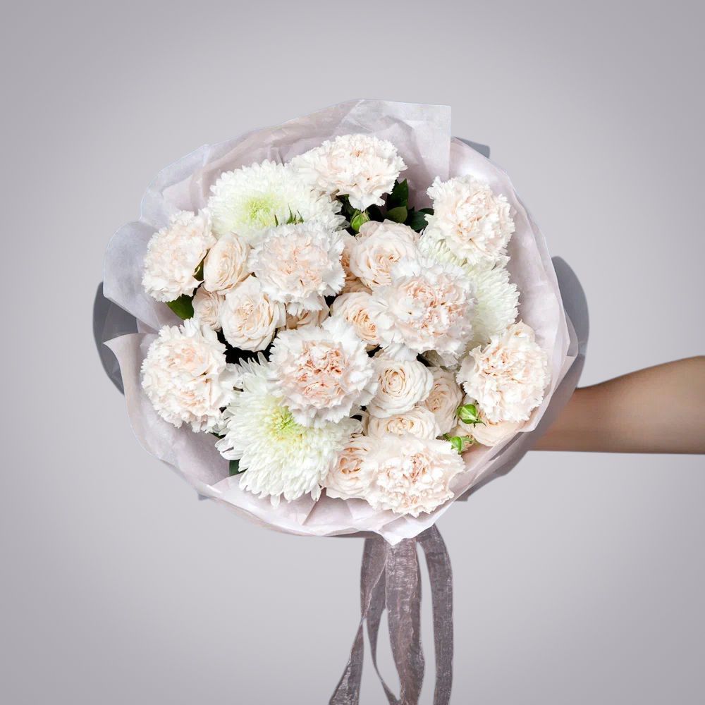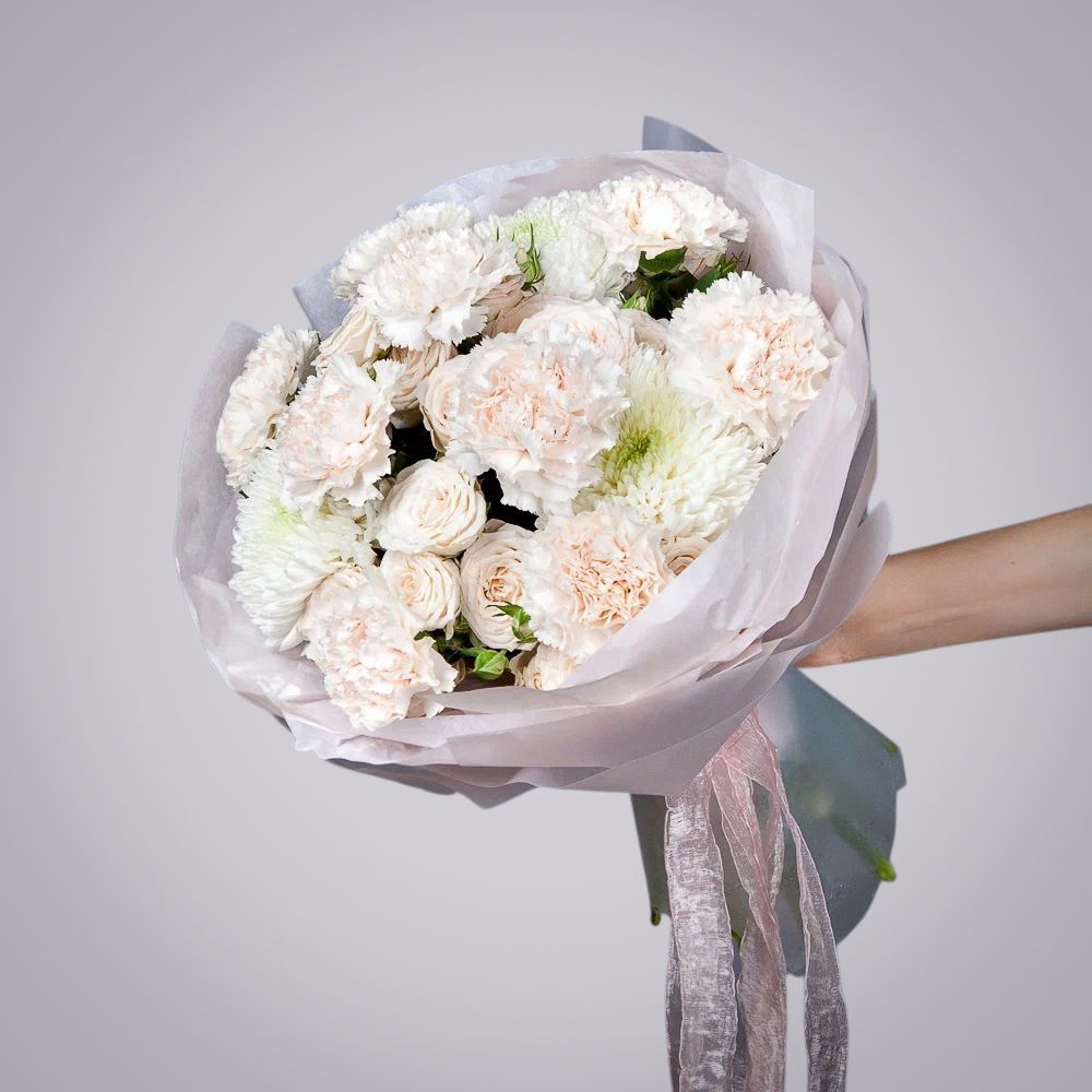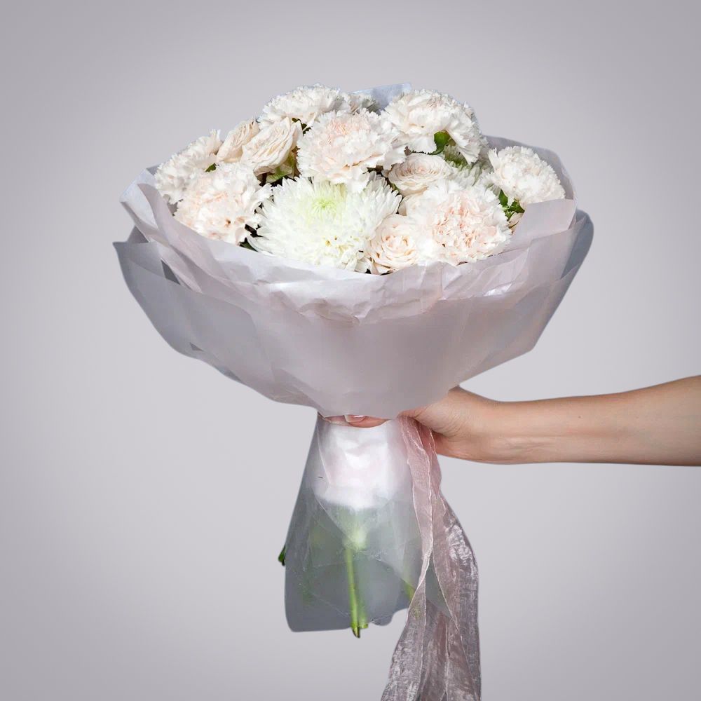 Состав: роза кустовая(5), гвоздика (9), хризантема(3), рускус(0,3), упаковка с тишью(3), упаковка(1), лента(2)