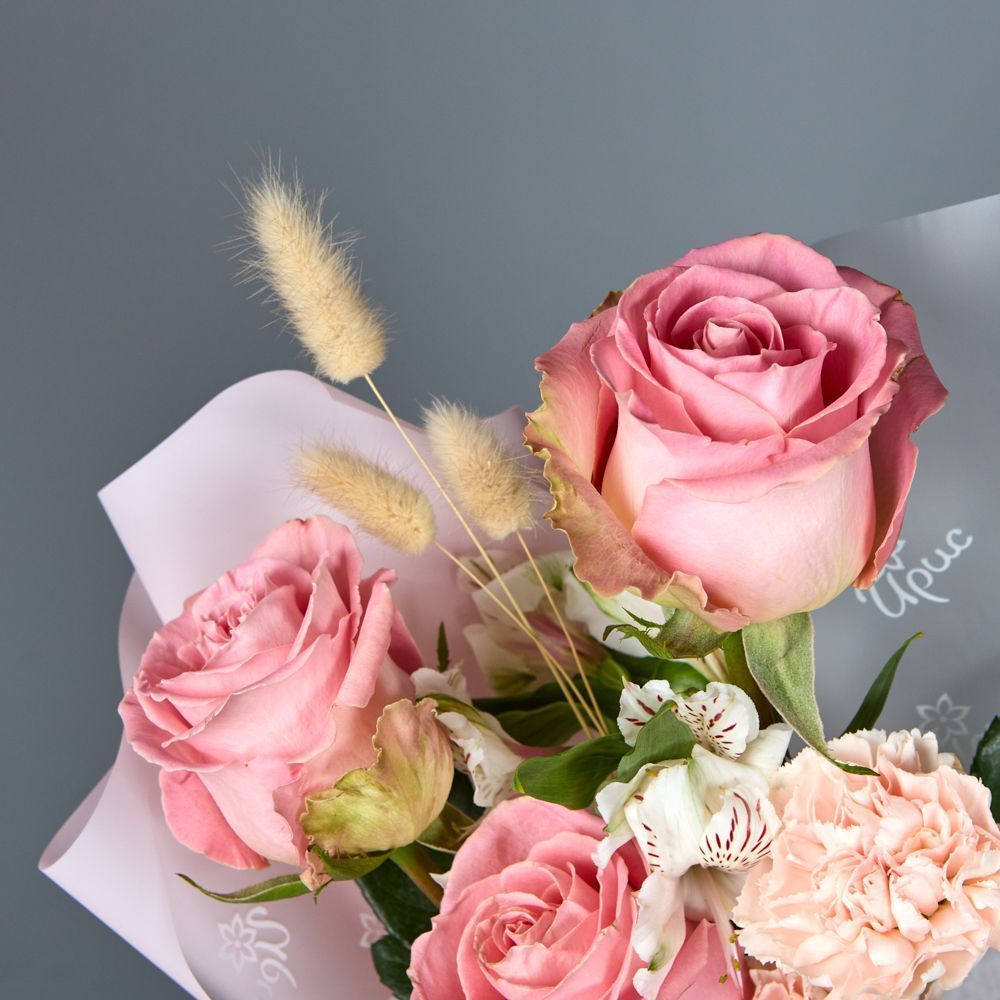 Состав: Роза (3), гвоздика (2), альстромерия (1), лагурус натуральный (0,1), упаковка бренд (0,5), упаковка розовая полупрозрачная (0,5), лента (2)