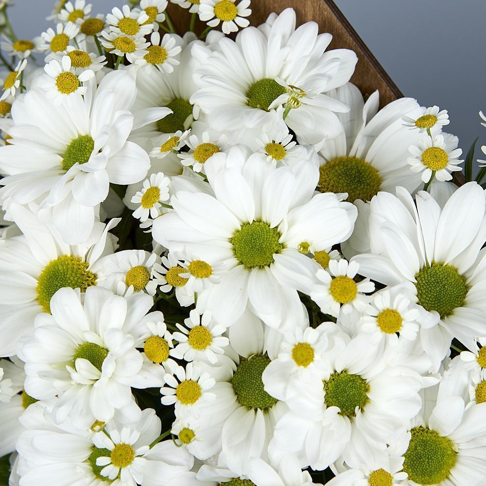 На изображении представлена композиция под названием "Белые мечты". Это изысканная композиция, состоящая из белых хризантем и танацетума, которые символизируют чистоту, невинность и элегантность. Хризантемы собраны в деревянном конверте, что придает композиции утонченный вид. Такая композиция идеально подходит для создания атмосферы спокойствия и уюта, а также может быть прекрасным подарком для выражения нежных чувств и восхищения.